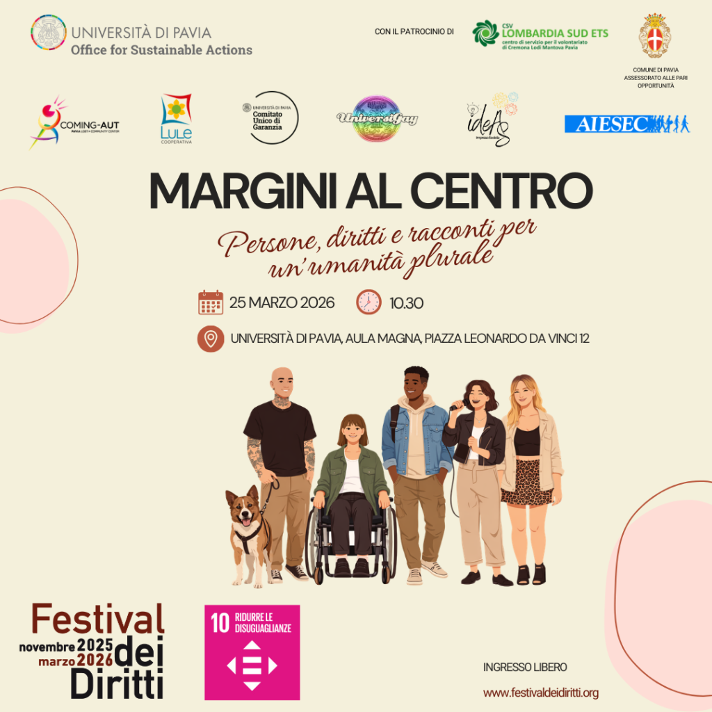 Raccontare i margini per rimettere al centro le persone, i diritti e il valore delle differenze. È questo l’obiettivo di “Margini al centro. Persone, diritti e racconti per un’umanità plurale”, in programma martedì 25 marzo 2026 alle ore 10:30 in Aula Magna, Piazza Leonardo Da Vinci 12, nell’ambito del Festival dei Diritti 2025–2026. L’iniziativa, che è promossa dall’OSA – Office for Sustainable […]